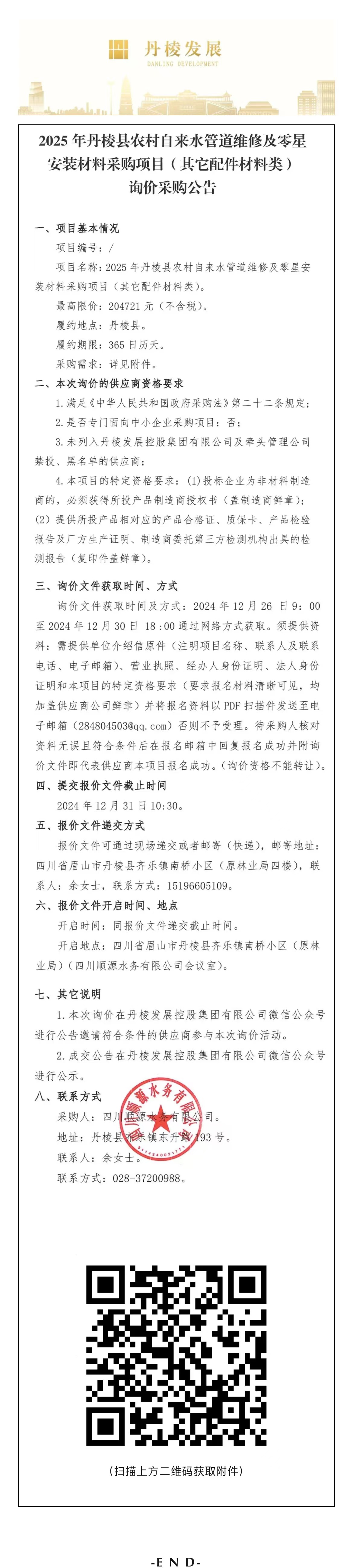 2025年丹棱縣農村自來水管道維修及零星安裝材料采購項目(其他配件材料類)詢價采購公告