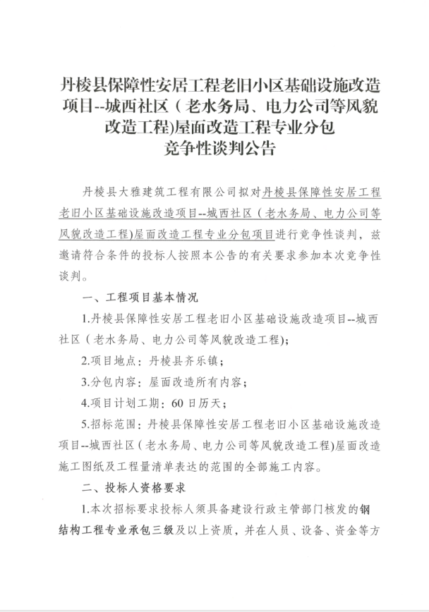 【大雅建筑公司】丹棱縣保障性安居工程老舊小區(qū)基礎設施改造項目--城西社區(qū)(老水務局、電力公司等風貌改造工程)屋面改造工程專業(yè)分包競爭性談判公告