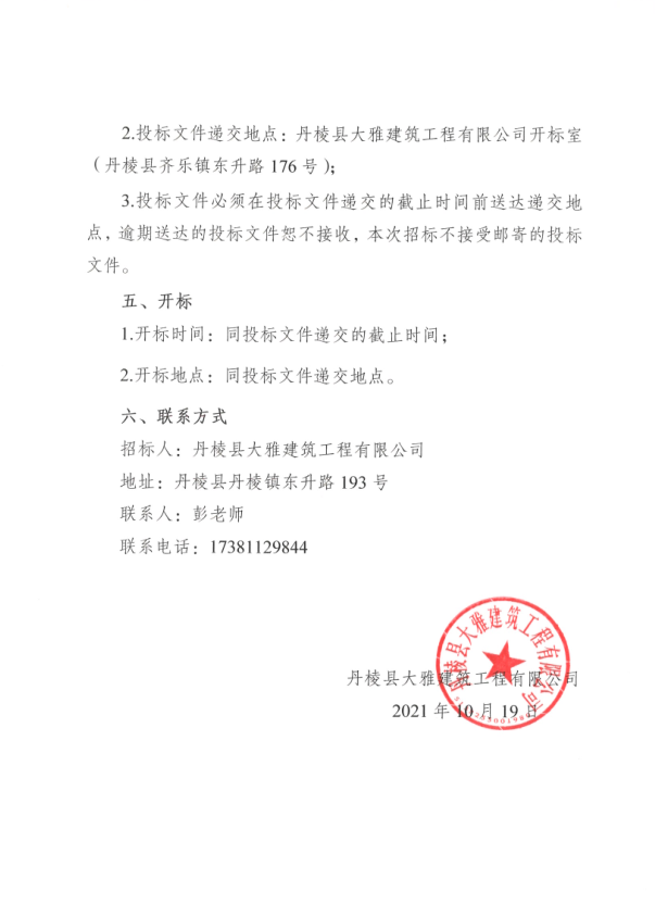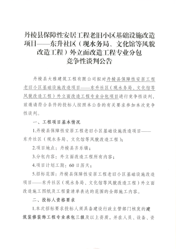 【大雅建筑公司】丹棱縣保障性安居工程老舊小區(qū)基礎(chǔ)設(shè)施改造項(xiàng)目--東升社區(qū)(現(xiàn)水務(wù)局、文化館等風(fēng)貌改造工程)外立面改造工程專業(yè)分包競(jìng)爭(zhēng)性談判公告