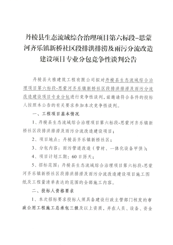【大雅建筑公司】丹棱縣生態(tài)流域綜合治理項(xiàng)目第六標(biāo)段-思蒙河齊樂鎮(zhèn)新橋社區(qū)段排洪排澇及雨污分流改造建設(shè)項(xiàng)目專業(yè)分包競爭性談判公告