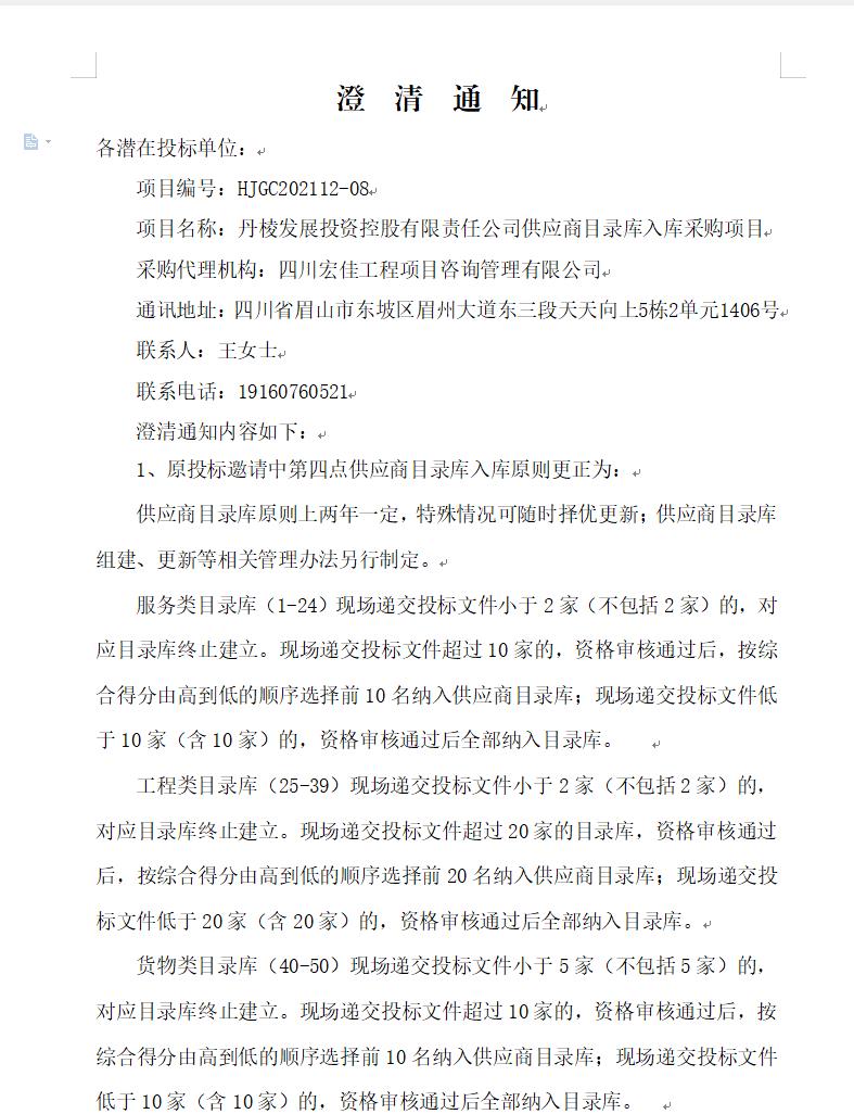 【丹發(fā)展公司】丹棱發(fā)展投資控股有限責(zé)任公司供應(yīng)商目錄庫(kù)入庫(kù)采購(gòu)項(xiàng)目澄清通知