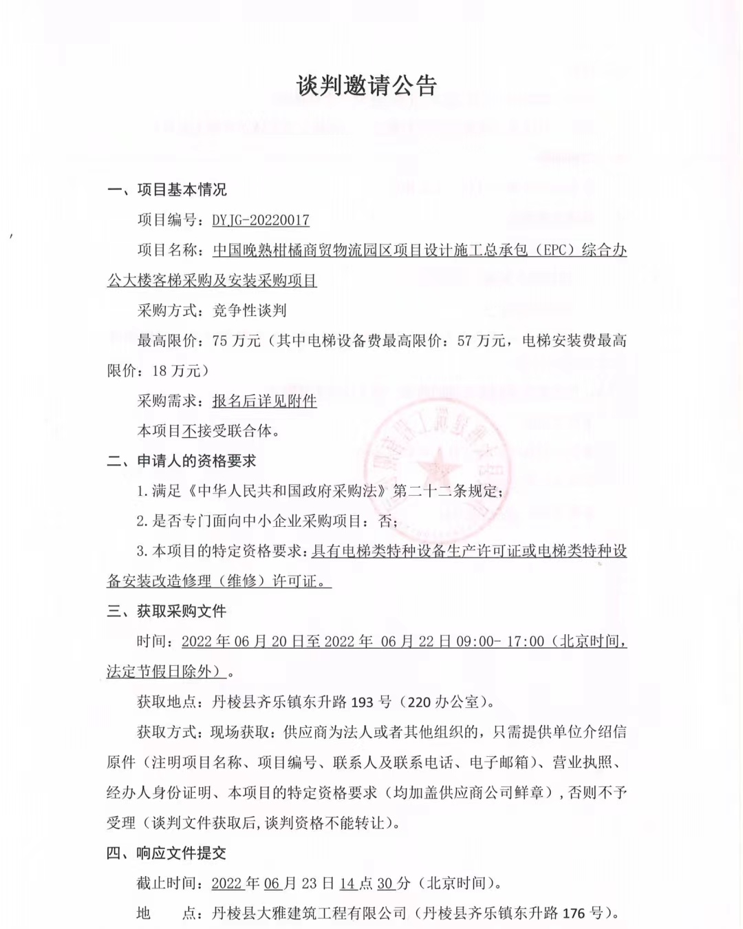中國晚熟柑橘商貿(mào)物流園區(qū)項(xiàng)目設(shè)計(jì)施工總承包(EPC)綜合辦公大樓客梯采購及安裝采購項(xiàng)目談判邀請公告