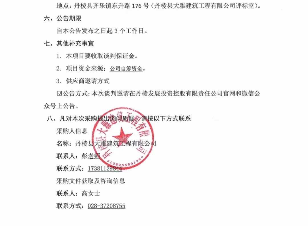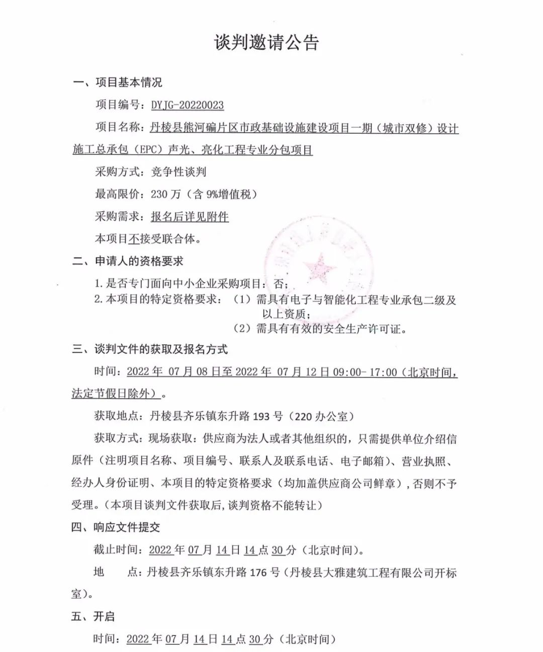 丹棱縣熊河碥片區(qū)市政基礎(chǔ)設(shè)施建設(shè)一期(城市雙修)設(shè)計(jì)施工總承包(EPC)聲光、亮化工程專業(yè)分包項(xiàng)目談判邀請公告