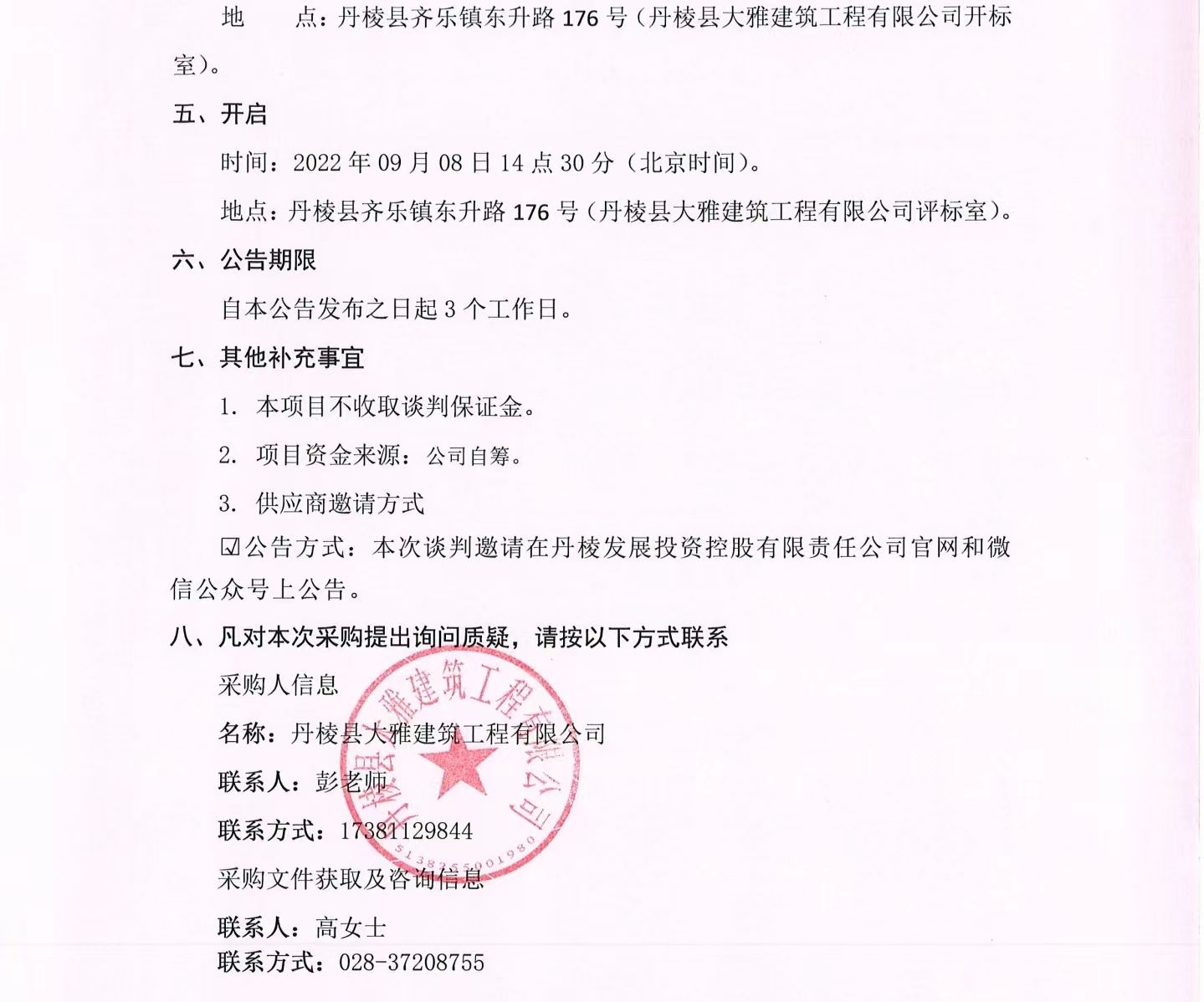 丹棱縣熊河碥片區(qū)市政基礎(chǔ)設(shè)施建設(shè)項(xiàng)目一期(城市雙修)設(shè)計(jì)施工總承包(EPC)異形構(gòu)筑物(親水亭)采購(gòu)項(xiàng)目談判邀請(qǐng)公告