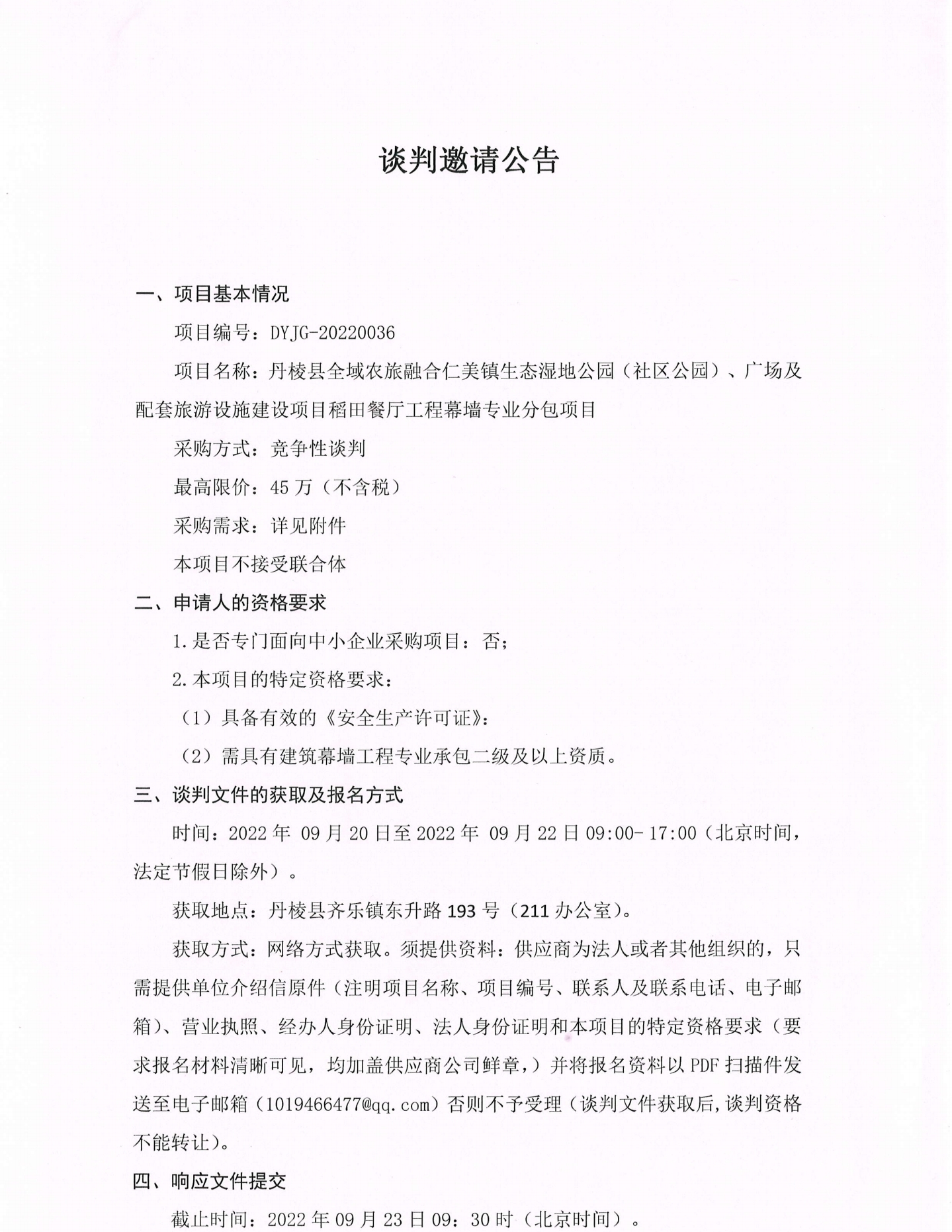 丹棱縣全域農(nóng)旅融合仁美鎮(zhèn)生態(tài)濕地公園(社區(qū)公園)、廣場及配套旅游設(shè)施建設(shè)項(xiàng)目稻田餐廳工程幕墻專業(yè)分包項(xiàng)目談判邀請(qǐng)公告