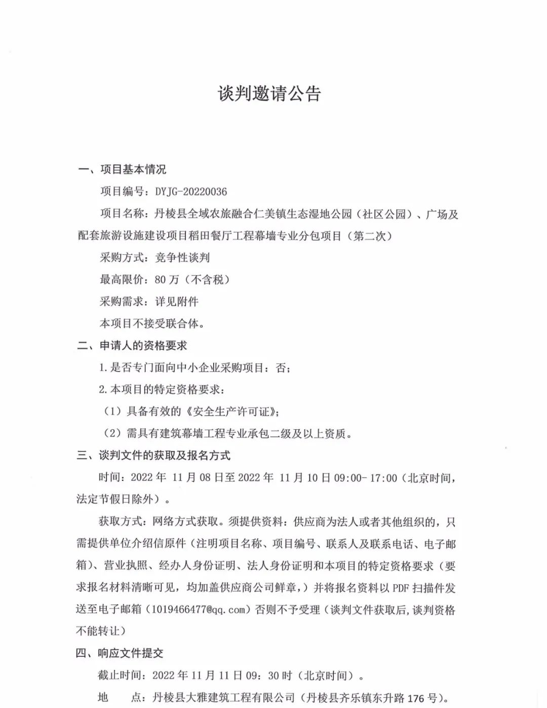 丹棱縣全域農(nóng)旅融合仁美鎮(zhèn)生態(tài)濕地公園(社區(qū)公園)、廣場(chǎng)及配套旅游設(shè)施建設(shè)項(xiàng)目稻田餐廳工程幕墻專(zhuān)業(yè)分包項(xiàng)目(第二次)談判邀請(qǐng)公告