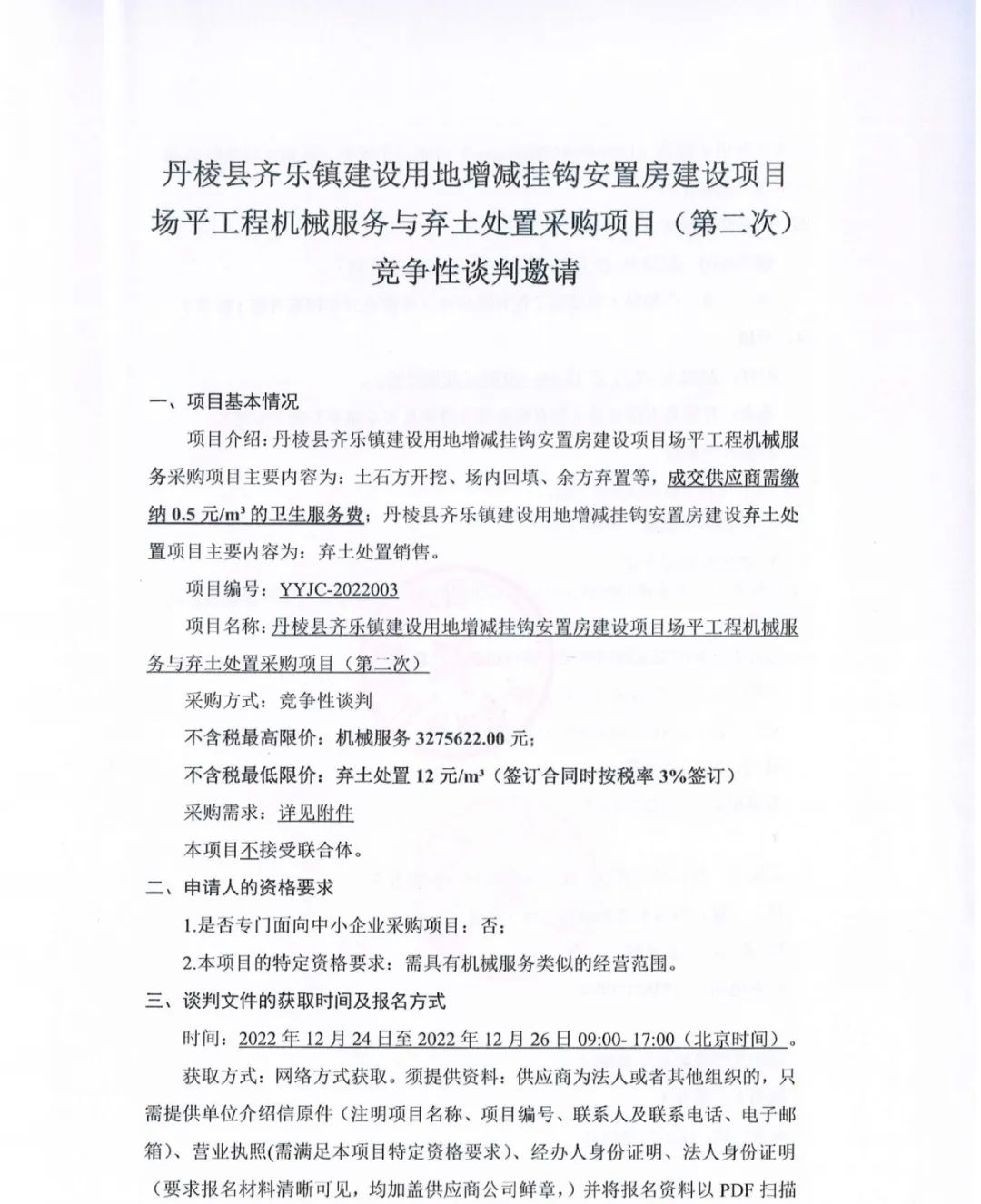 丹棱縣齊樂鎮(zhèn)建設(shè)用地增減掛鉤安置房建設(shè)項(xiàng)目場(chǎng)平工程機(jī)械服務(wù)與棄土處置采購項(xiàng)目(第二次)競(jìng)爭(zhēng)性談判邀請(qǐng)