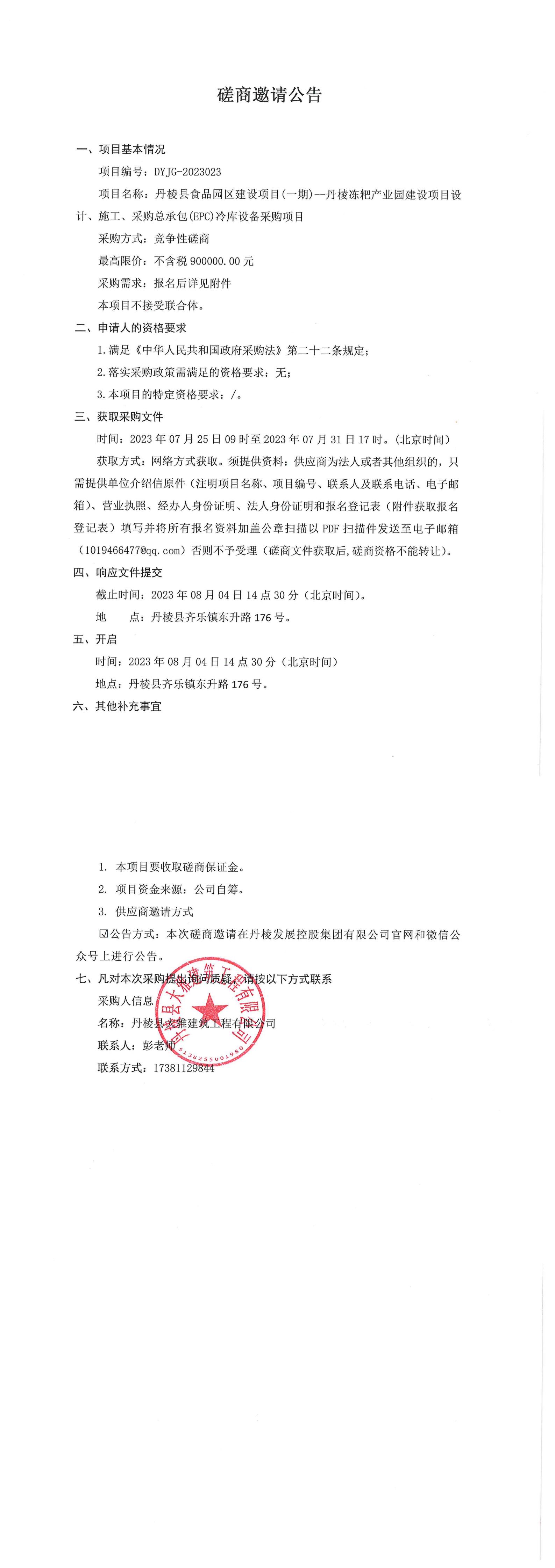 丹棱縣食品園區(qū)建設項目(一期)--丹棱凍粑產(chǎn)業(yè)園建設項目設計、施工、采購總承包(EPC)冷庫設備采購項目磋商邀請公告