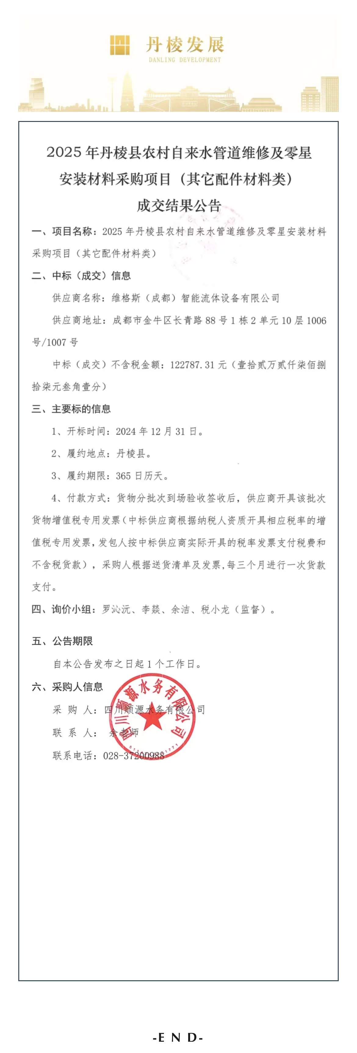 2025年丹棱縣農(nóng)村自來水管道維修及零星安裝材料采購項目(其他配件材料類)成交結(jié)果公告