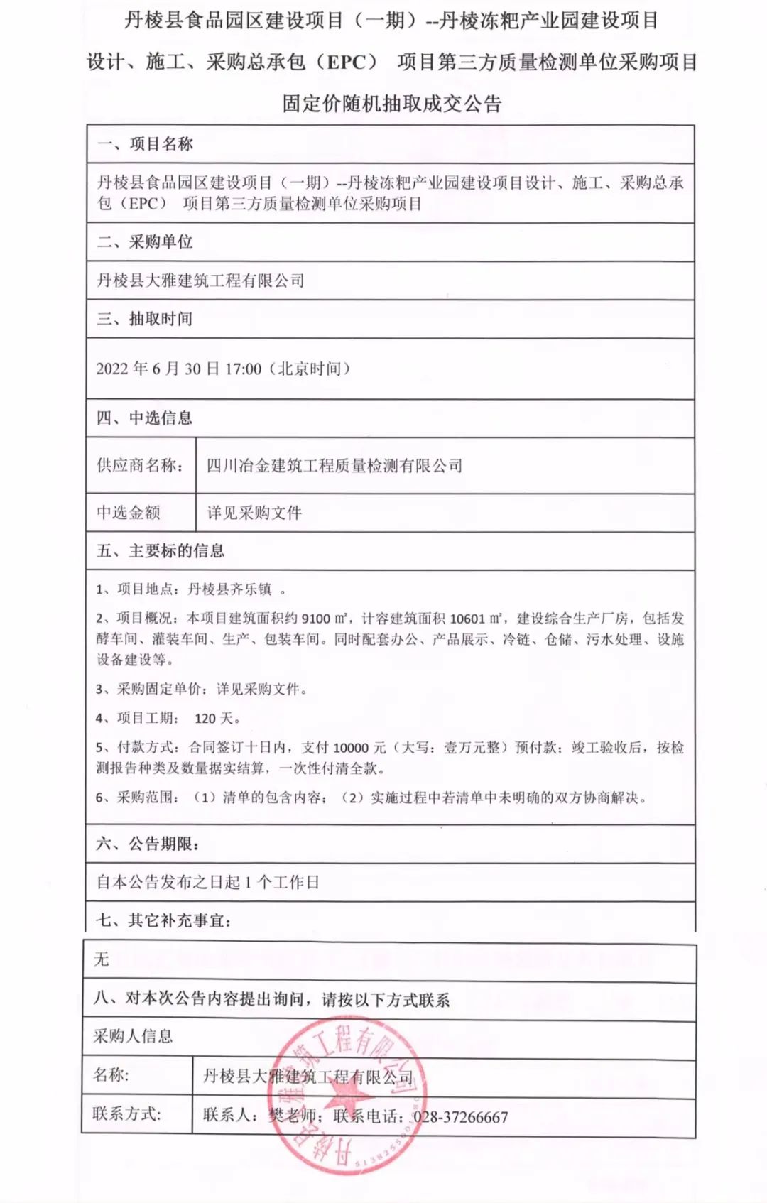 丹棱凍粑產(chǎn)業(yè)園建設(shè)項目設(shè)計、施工、采購總承包(EPC)項目第三方質(zhì)量檢測單位采購項目固定價隨機(jī)抽取成交公告