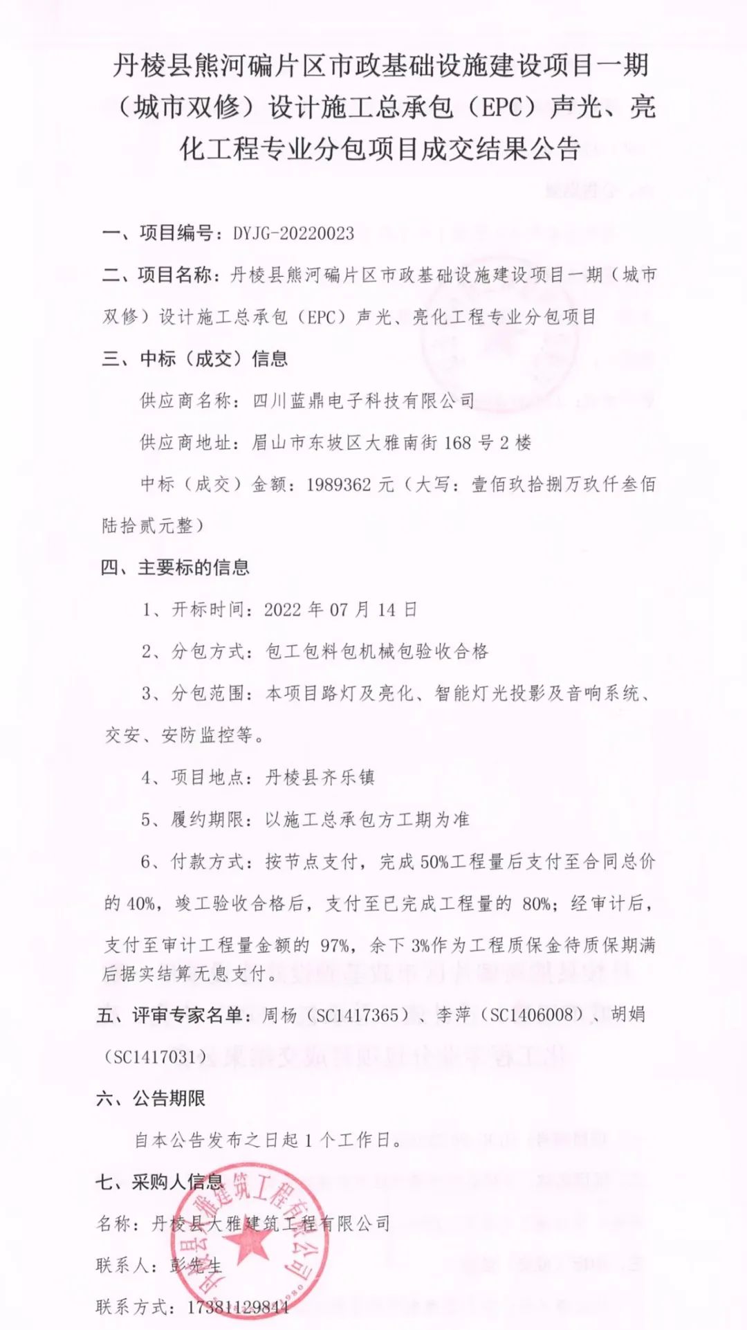 丹棱縣熊河碥片區(qū)市政基礎(chǔ)設(shè)施建設(shè)項(xiàng)目一期(城市雙修)設(shè)計(jì)施工總承包(EPC)聲光、亮化工程專(zhuān)業(yè)分包項(xiàng)目成交結(jié)果公告