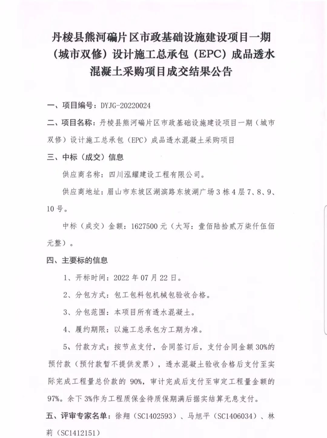 丹棱縣熊河碥片區(qū)市政基礎設施建設項目一期(城市雙修)設計施工總承包(EPC)成品透水混凝土采購項目成交結(jié)果公告