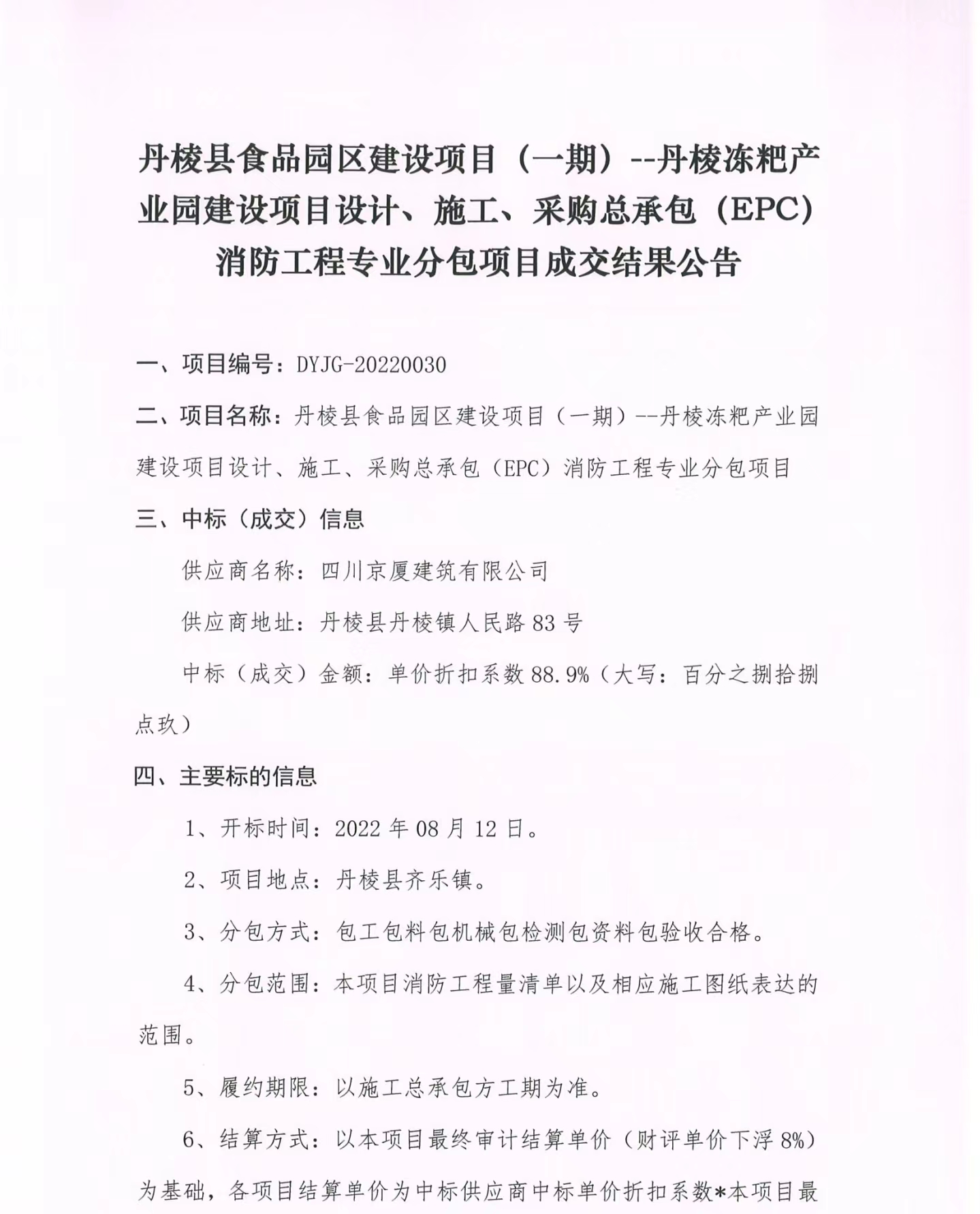 丹棱縣食品園區(qū)建設(shè)項(xiàng)目(一期)--丹棱凍粑產(chǎn)業(yè)園建設(shè)項(xiàng)目設(shè)計(jì)、施工、采購總承包(EPC)消防工程專業(yè)分包項(xiàng)目成交結(jié)果公告