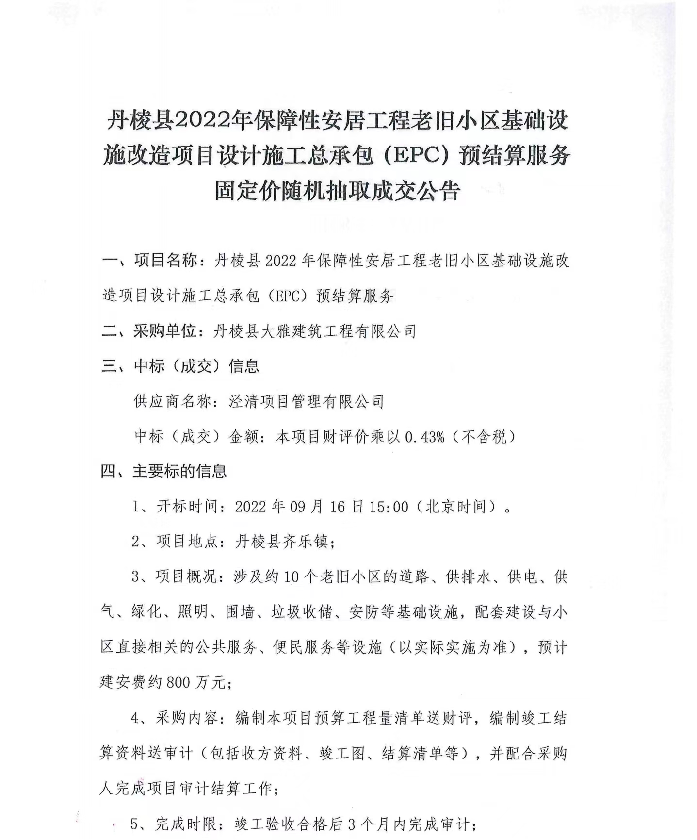 丹棱縣2022年保障性安居工程老舊小區(qū)基礎(chǔ)設施改造項目設計施工總承包(EPC)預結(jié)算服務固定價隨機抽取成交公告