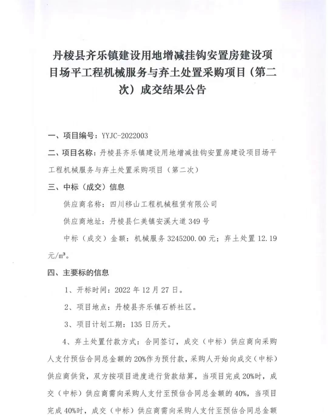丹棱縣齊樂鎮(zhèn)建設(shè)用地增減掛鉤安置房建設(shè)項目場平工程機械服務與棄土處置采購項目(第二次)成交結(jié)果公告