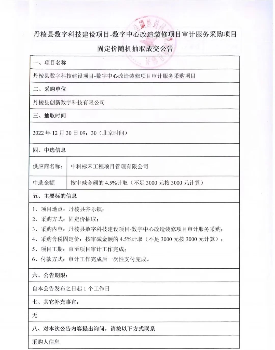 丹棱縣數(shù)字科技建設(shè)項(xiàng)目-數(shù)字中心改造裝修項(xiàng)目審計服務(wù)采購項(xiàng)目固定價隨機(jī)抽取成交公告