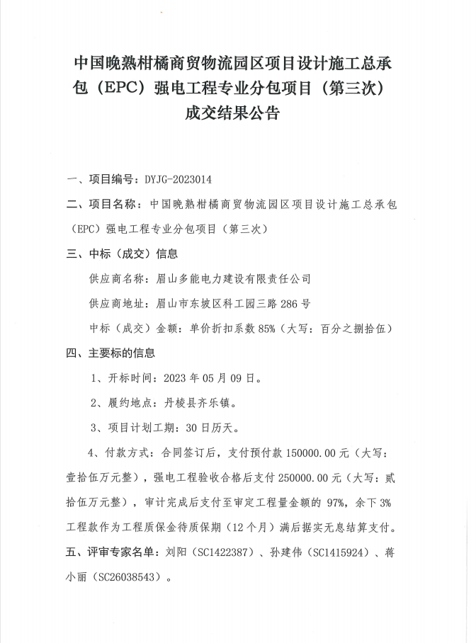 中國晚熟柑橘商貿(mào)物流園區(qū)項(xiàng)目設(shè)計(jì)施工總承包(EPC)強(qiáng)電工程專業(yè)分包項(xiàng)目(第三次)成交結(jié)果公告