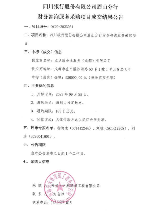 四川銀行股份有限公司眉山分行財(cái)務(wù)咨詢服務(wù)采購項(xiàng)目成交結(jié)果公告