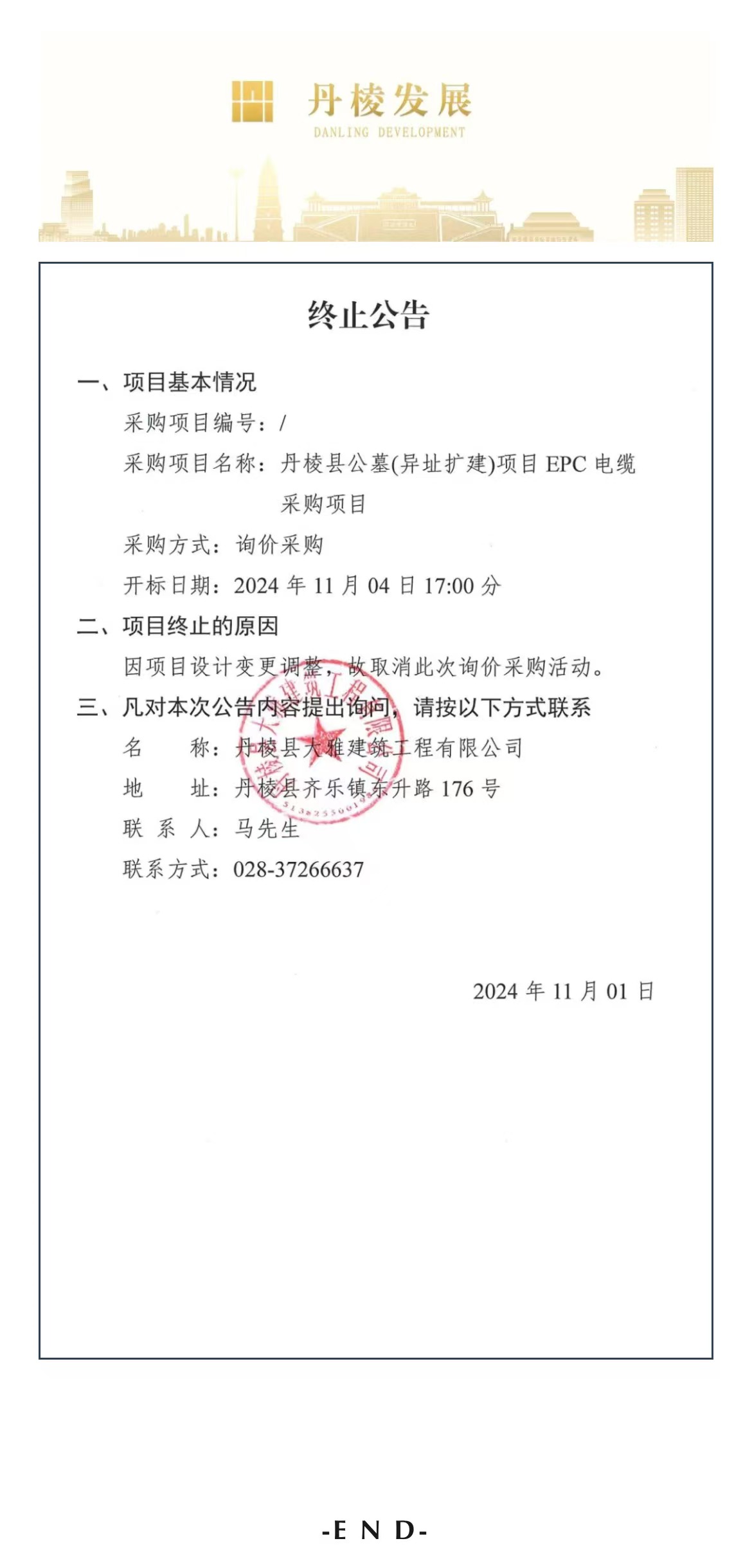 丹棱縣大雅建筑工程有限公司丹棱縣公墓(異址擴建)項目EPC電纜采購終止公告