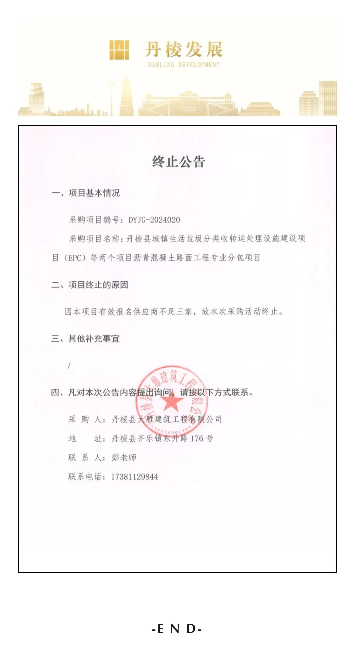 丹棱縣城鎮(zhèn)生活垃圾分類收轉(zhuǎn)運處理設施建設項目(EPC)等兩個項目瀝青混凝土路面工程專業(yè)分包項目終止公告