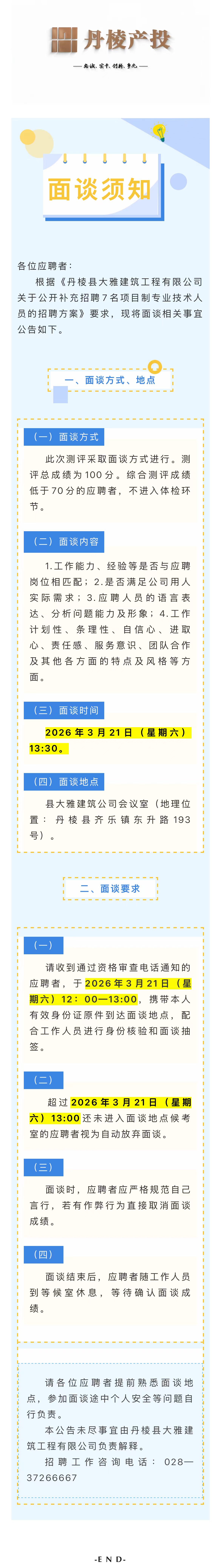 丹棱縣大雅建筑工程有限公司關(guān)于公開補(bǔ)充招聘7名項目制專業(yè)技術(shù)人員的面談須知