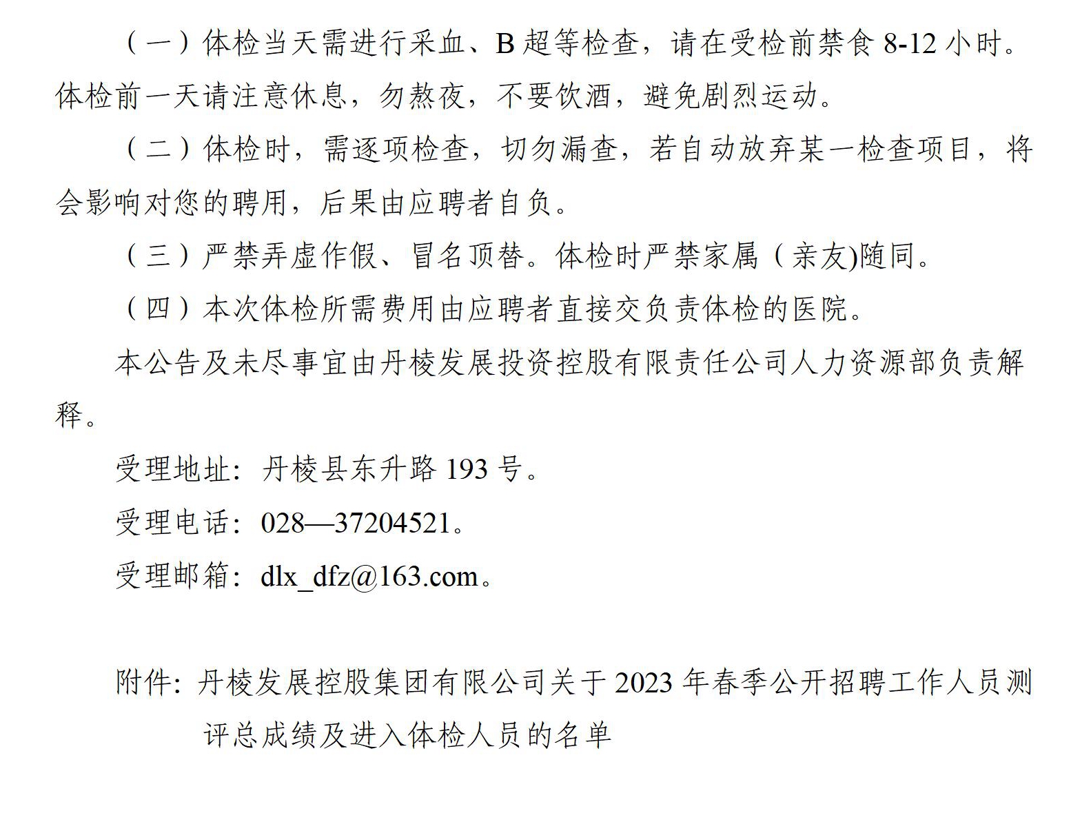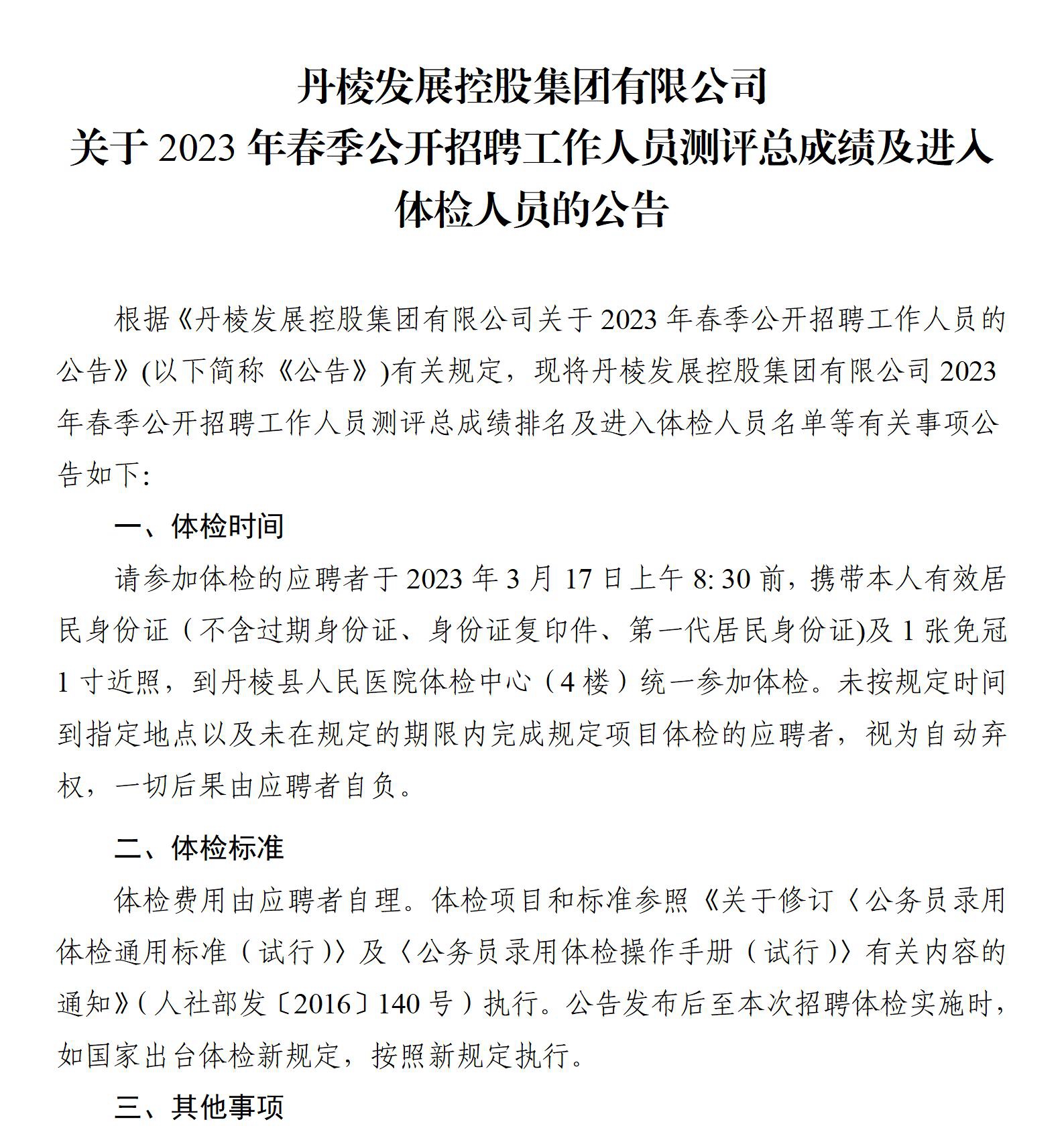 丹棱發(fā)展控股集團(tuán)有限公司關(guān)于2023年春季公開招聘工作人員測(cè)評(píng)總成績及進(jìn)入體檢人員的公告